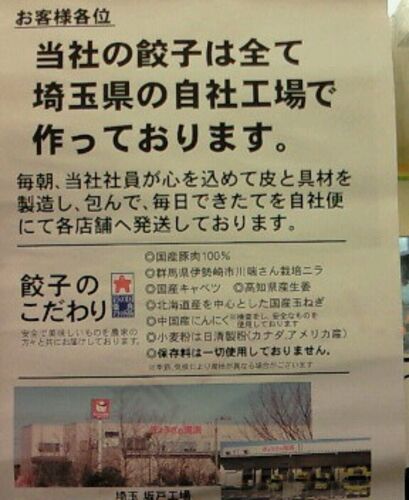 今日は激しく疲れていたこともあり、駅前にある唯一の某餃子屋さんへw 入るのに多少勇気がいりましたが、店の入口にこんな貼り紙が… お店も必死なんでしょうね(・∀・;) とりあえずラーメンと餃子のセットを注文し、待ってる間店舗情報とか載ってる紙があっ…